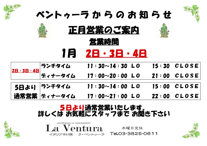 Home › NEWS › 2026年1月の営業について 2026-01-01 2026年1月の営業について いつも、ガーデンスクウェアをご愛顧いただき、誠にありがとうございます。 2026年1月の営業カレンダーをご案内いたします。 新年は、2日からの営業でございます。 スタッフ一同、皆さまのご来店を心よりお待ちしております。 関連記事 お祝い事は、ラ・べントゥーラで 2022.9.25(日)浴衣でナイトフェス!開催レポ 🍁紅葉🍁テラス席の眺めも素敵です テイクアウト 好評です! 4/17(金)の営業時間とお弁当のご案内 2020年の桜も🌸 お祝い事は、ラ・べントゥーラで